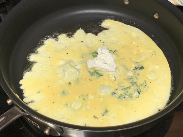 - Au bout de 2 min, baissez le feu, couvrez et laissez cuire jusqu’à ce que la surface de l’omelette soit presque prise mais encore légèrement baveuse. Pliez-la en deux sur elle-même, servez-la.