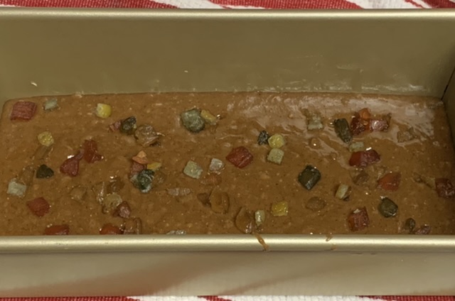 - Versez la préparation dans un moule à cake beurré, déposez des fruits confits et enfournez et laissez cuire 1 heure.