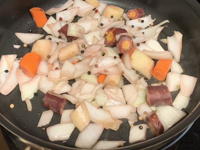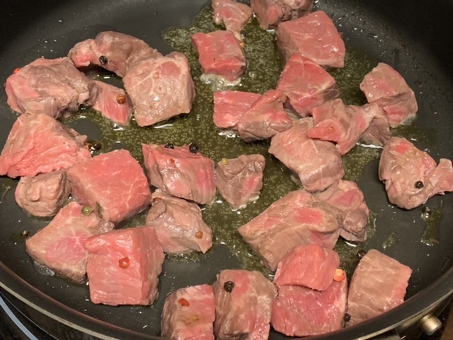 - Egoutter et séparer les légumes, le vin et la viande (réserver le bouquet garni). Sécher la viande et la colorer dans un peu d’huile à la poêle. Égoutter la viande.