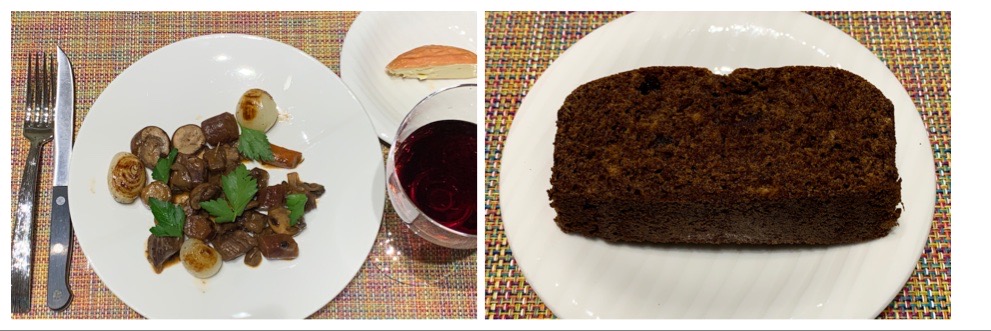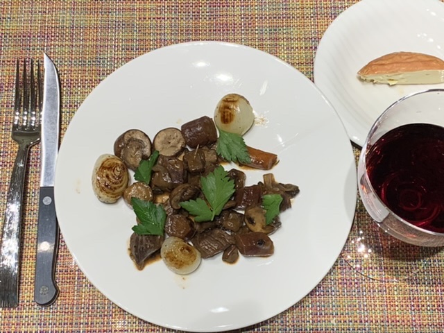 J’ai des larmes aux yeux. Vous savez qu’il y a des départements que j’aime fortement, où la cuisine m’a demandé de faire quelque chose de spécial. Je pense surtout aux dîners ardéchois, calvadosien, et aubois. Mais celui-ci, c’est le dîner bien français, ce qui me rappelle qu’à mon avis, il y a le français, puis l’italien, puis quelques plats de notre sud-ouest, puis le reste. Je vous présente le bœuf bourguignon et le pain d’épices de Dijon.