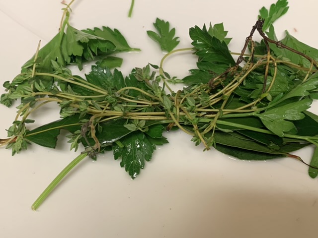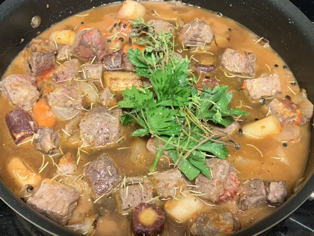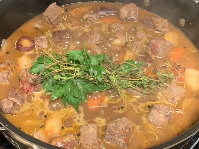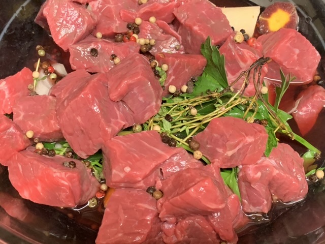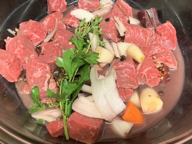 - La veille, mettre le bœuf dans un bol avec les légumes émincés. Ajouter les gousses d’ail écrasées, le bouquet garni, les grains de poivre et le vin rouge. Laisser mariner pendant 24 heures. — J’attache mes bouquets garni avec une pièce de thym, pas un string.