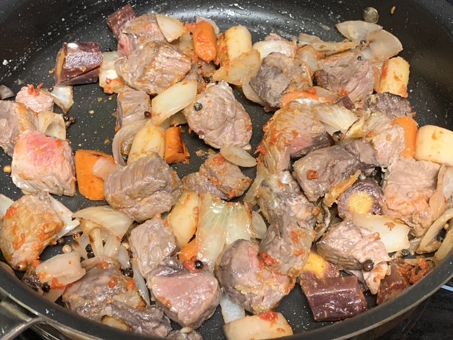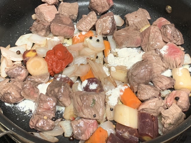 - Chauffer un peu d’huile dans une grande casserole et colorer les légumes émincés. Ajouter le concentré de tomates, la viande et la farine. Mélanger bien et mettre la casserole au four pendant quelques minutes pour cuire la farine.