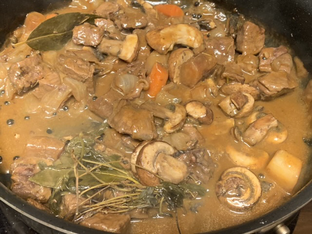 - Porter de nouveau à ébullition, couvrir et cuire au four pendant environ 1 heure et 15 minutes. Lorsque la viande est cuite, retirer et placer dans une plaque à bords ; couvrir avec un linge humide. — Pendant que votre bœuf cuit, faites vos oignons et vos champignons. Ne perdez pas vos temps !