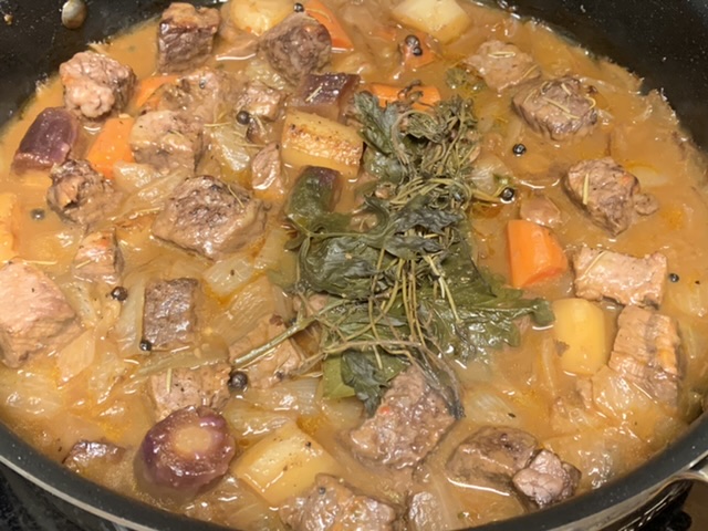 - Porter le liquide de la marinade à ébullition, écumer. Passer le liquide au chinois sur la viande et mélanger bien. Ajouter le fond de veau brun et le bouquet garni, et assaisonner. — J’ai ajouté une peu de romarin sec ici ; on peut le voir à droite.