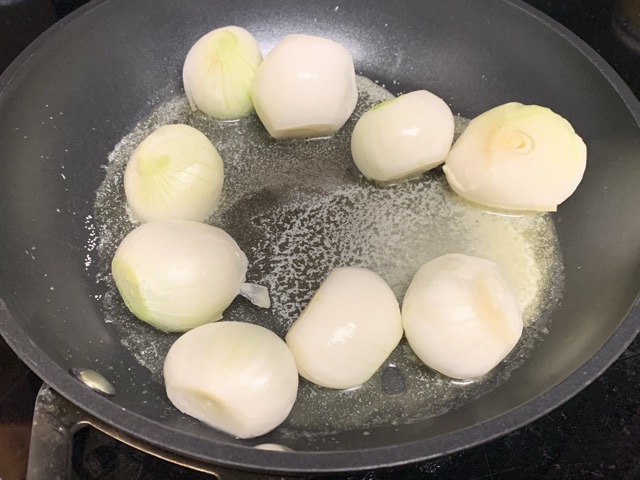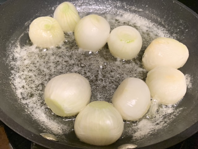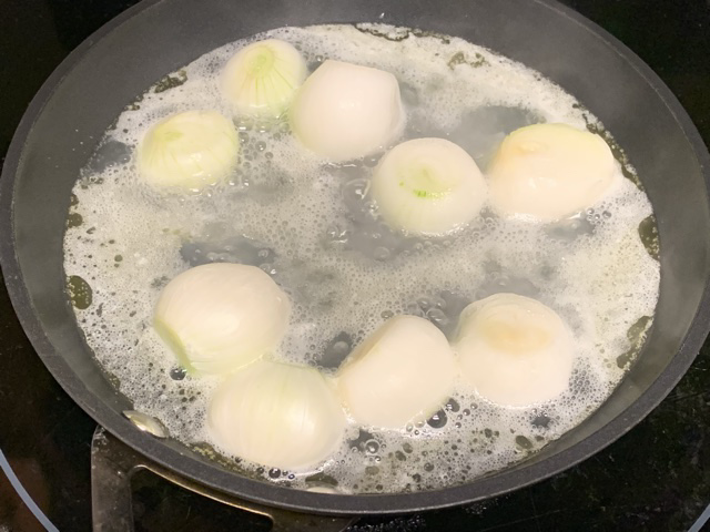 - Mettre les oignons dans une casserole avec un peu de beurre et une pincée de sucre et de sel, couvrir à hauteur d’eau.
