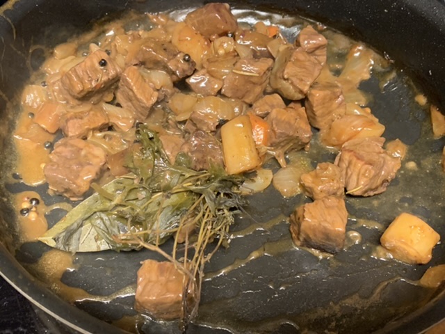 J’ai trouvé des vrais fruits confits français pour le pain d’épices, et le mélange d’épices aussi. Vous pouvez les voir dans mon post sur myPanier. Je dois la recette du bœuf bourguignon au Cordon Bleu, et la recette du pain d’épices au site Cuisine Actuelle. Comme d’habitude, il y a des changements au plat principal à cause d’être seul. En plus de couper les ingrédients, je n’ai fait pas de lardons ni croûtons. Il n’y aurait pas assez d’ingrédients pour valoir le coup de les faire.