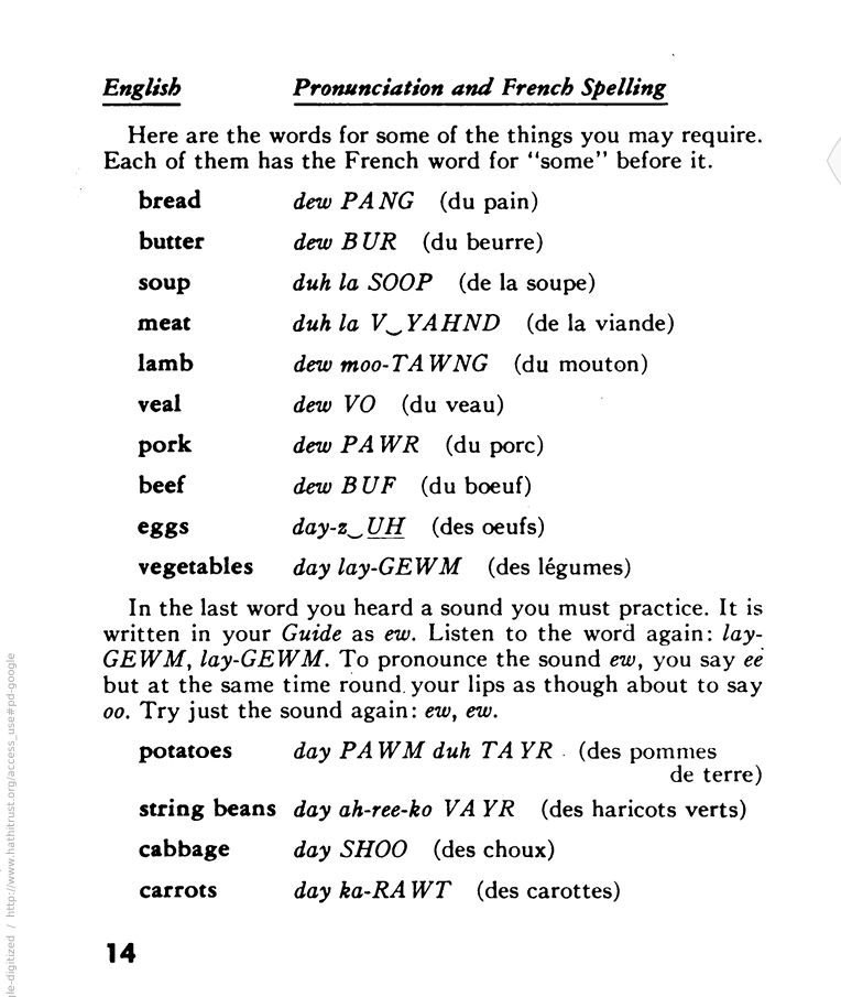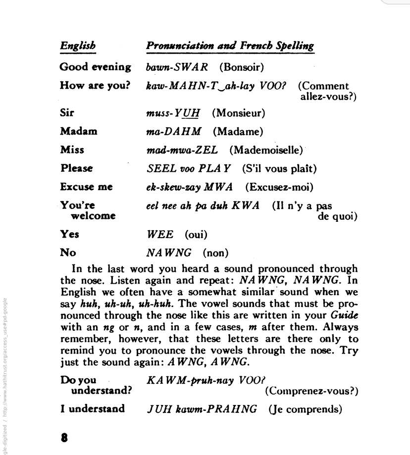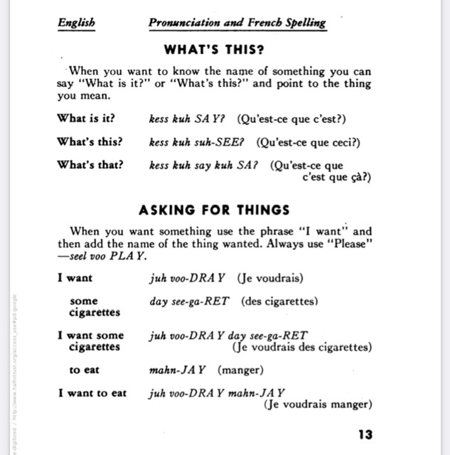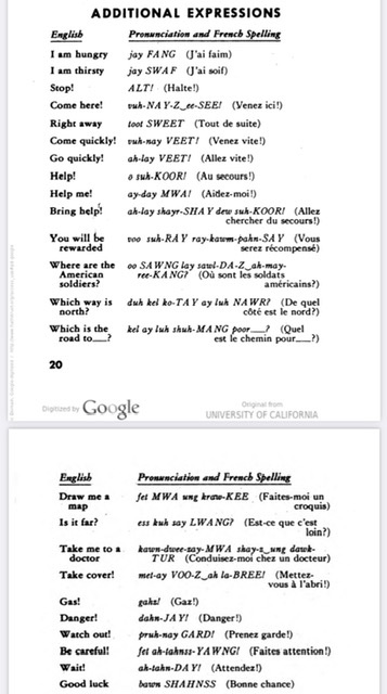Grâce à l’un de mes groupes sur Facebook, Secrets d’Histoire, j’ai découvert un petit livre intéressant, publié par le Ministère de la Guerre des États-Unis pendant la Seconde Guerre Mondiale. Il s’appelle « French : A Guide to the Spoken Language » (Le Français : Guide de la langue parlée). On peut le trouver sur l’Archive Internet. Voici des exemples :