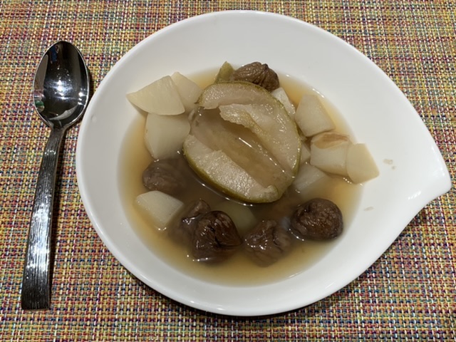 « Rave » peut signifier soit « radis » soit « navet » selon mon dictionnaire bilingue, alors j’ai choisi un navet. Si j’ai tort, c’était quand même délicieux. La recette originale demande aussi des « poires d’hiver ». Je ne suis pas sûr de la variété, alors j’ai choisi des poires Anjou. Elles ont au moins un nom bien français, et elles étaient la meilleure partie de la soupe à la fin.