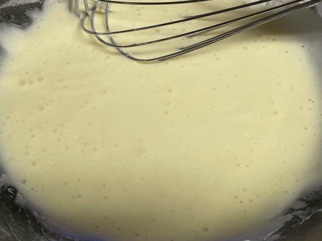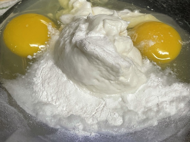 Dans une jatte, versez le yaourt, les oeufs, la levure, mélangez bien au fouet.