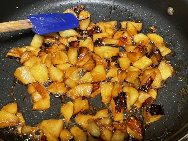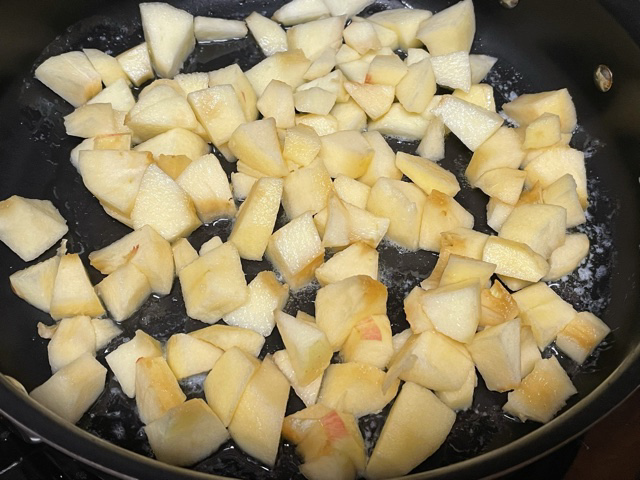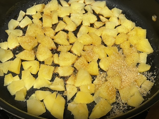 Ajoutez 2 cuillères à soupe bombées de sucre de canne complet, faites caraméliser les pommes pendant 5-7 minutes sans couvrir.