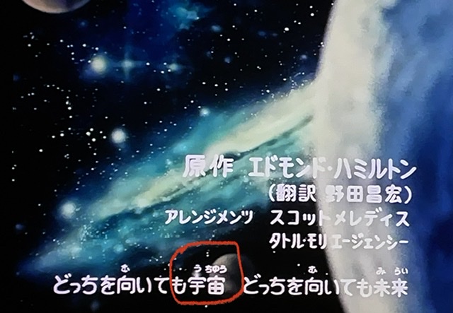 Voici les crédits, écrit dans leurs deux autres alphabets, le « hiragana » et le « kanji ». Le katakana et le hiragana servent le même but — écrire les mots d’une façon phonétique. Le kanji est le système de dessins compliqués qui sert à représenter des mots entiers. Il faut apprendre environ 2 000 kanji pour lire un journal, alors la plupart de japonais n’arrivent pas à faire ça jusqu’à ce qu’ils deviennent lycéens. Pour cette raison, c’est commun de donner les hiraganas sur les lettres kanji — regardez ce que j’ai encerclé en rouge :