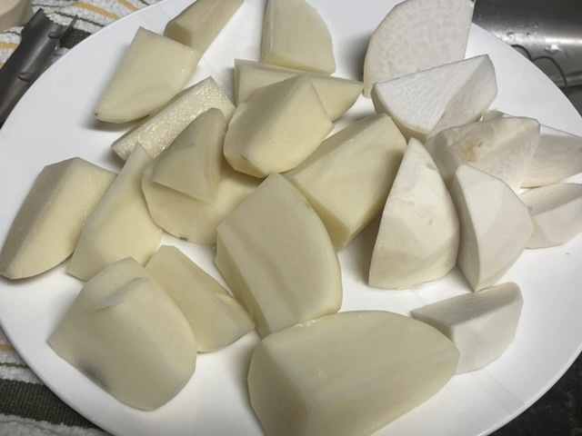Éplucher et couper en gros dès vos pommes de terre et navet.