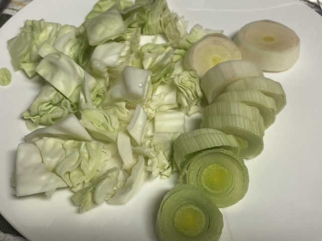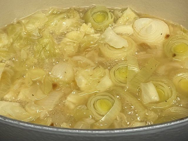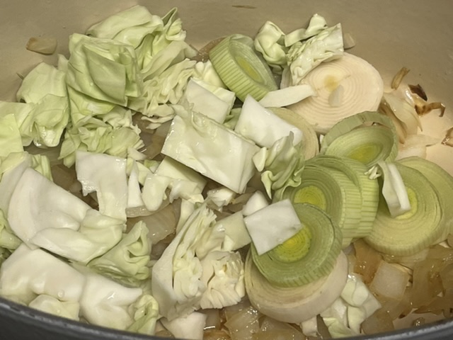 Pendant que les oignons dorent, couper votre poireau et le chou, puis les ajouter.