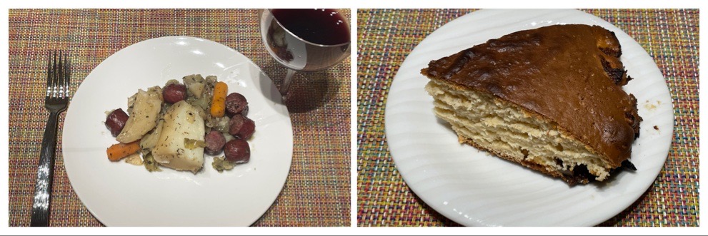 Ce soir, j’ai fait un dîner selon les coutumes du Doubs. J’ai un ami qui y vit, et il m’a dit de faire mon dessert, un « gâteau de fête », appelé aussi « gâteau de ménage ». En plat principal, nous avons la « potée comtoise ».