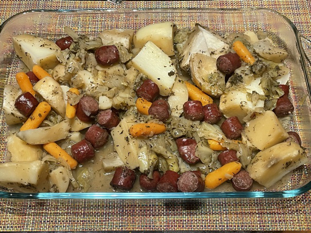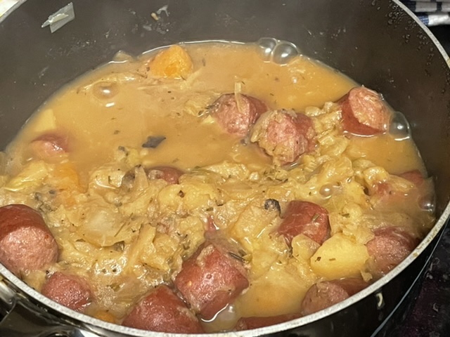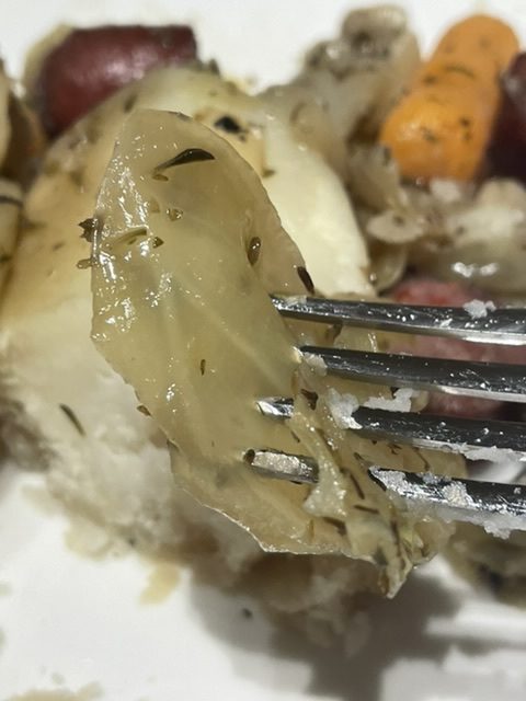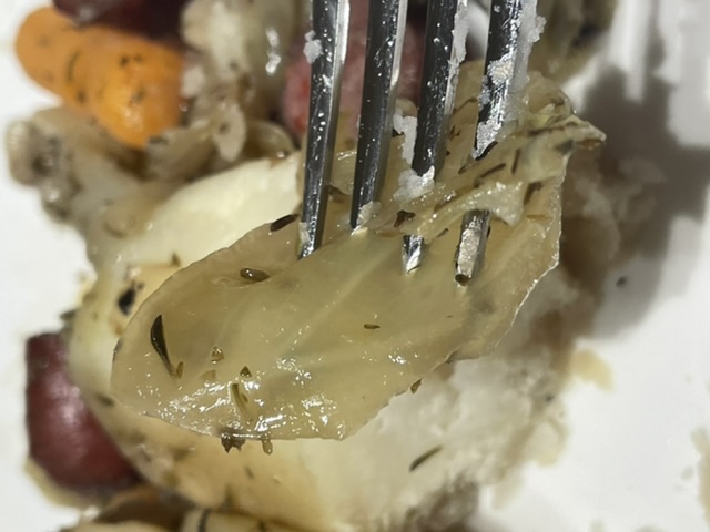 C’est bien trop cuit, à mon avis. Je dois vous dire qu’il y a ceux qui pensent que c’est le bon résultat. Vous pouvez trouver plusieurs vidéos sous le titre « La potée comtoise, star d’Internet » sur le lien de la recette. Dans deux vidéos, les chefs font des potées comme cette dernière. Je ne l’aime pas. Le goût n’est pas mal, mais je déteste l’apparence. Alors, j’ai étudié toutes les vidéos, et ma recette n’est pas exactement ce que vous trouverez dans n’importe quelle vidéo. Mais je suis FIER des résultats. Voici mon chou après la deuxième fois :