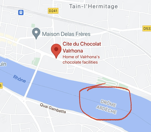 Et ce sera une GROSSE erreur de rater Tain-L’Hermitage, chez plusieurs vins AOC, dont le Crozes-hermitage et l’Hermitage. C’est aussi chez la Cité du Chocolat Valrhona. Euh, Justin, vous nous avez dit que c’est en Ardèche, n’est-ce pas ? Ben oui, mais c’est le site de tourisme d’Ardèche qui m’a trompé !
