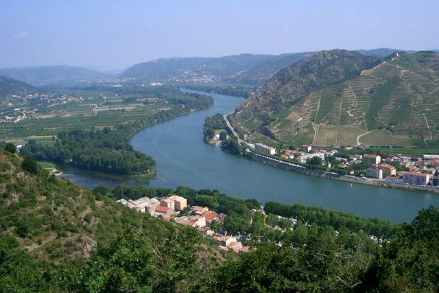 Tournon, le Rhône, et le Doux, Photo par PRA, CC BY-SA 3.0, Château de Crussol, Photo par Fabrice GALLET, Domaine public