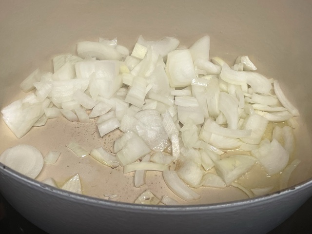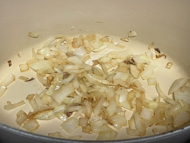 Dans une cocotte, faire dorer l’oignon avec une cuillère à soupe d’huile d’olive.
