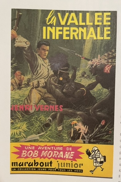La foule entière connaît toutes les paroles sur Bob Morane. Je n’ai jamais vu rien comme ça dans ma vie ! Mais bonne chance si vous voulez lire n’importe quel de ces livres ici. En tout cas, mon livre est le premier tome de l’intégrale de la bande-dessinée. Il commence avec une rédaction sur l’origine du personnage. Voilà, sa première aventure est aussi le début de la chanson. Égaré dans la vallée infernale…