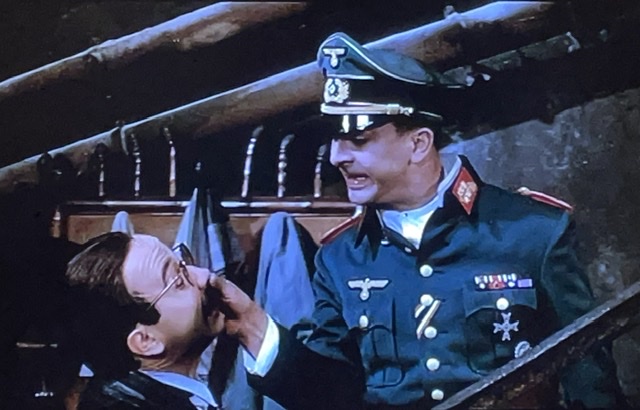 Je n’ai pas du tout compris ce qui s’est déroulé, mais plusieurs membres de la famille finissent par être dans un bureau de l’armée allemande, où ils rencontrent un soldat britannique. Il tue un Allemand — apparemment sans faire trop de bruit — et ils s’échappent.