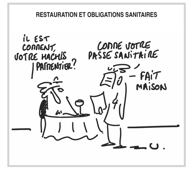 Je suis VRAIMENT en retard avec Le Canard Enchaîné cette semaine. On aurait pensé que dans son propre pays, je l’aurais lu tout de suite mercredi. Mais j’ai passé mercredi à Orléans, et je ne regrette pas du tout ce que j’ai fait au lieu. Les prochains deux jours ont été presque également occupés. Mais il s’avère que le thème du Canard cette semaine avait beaucoup à voir avec mon voyage ! Regarde, les mésaventures du pass sanitaire :