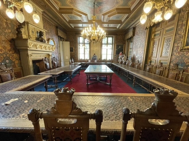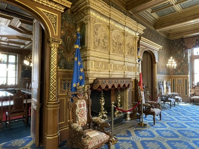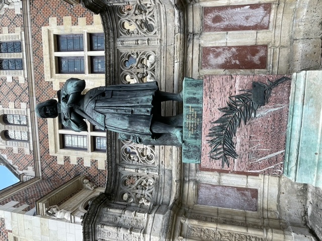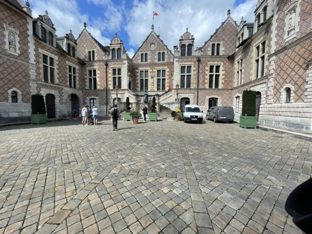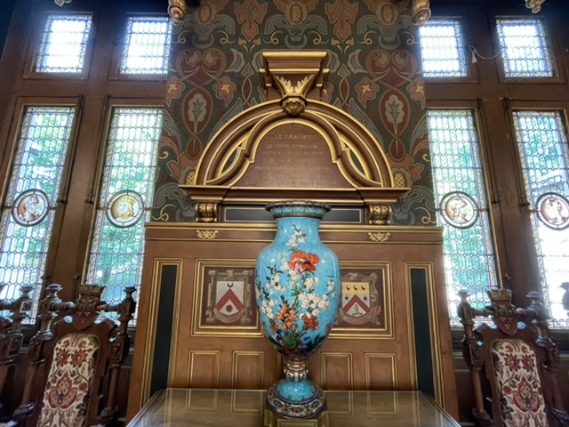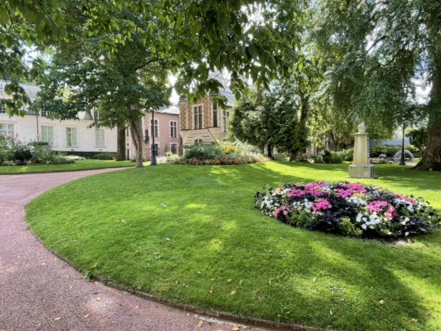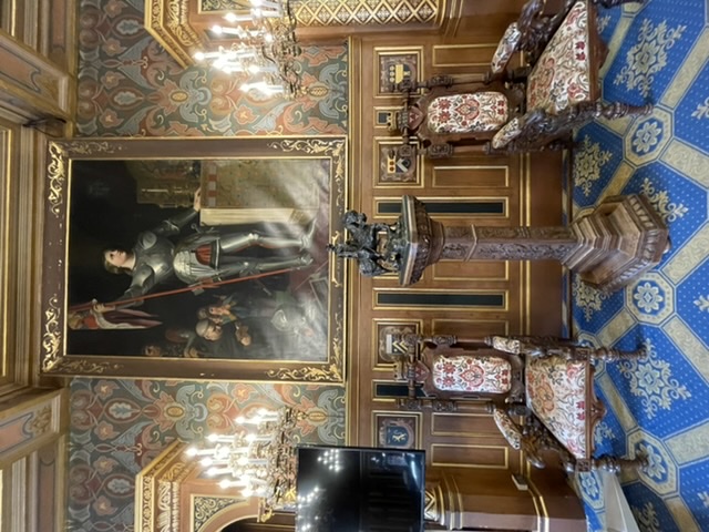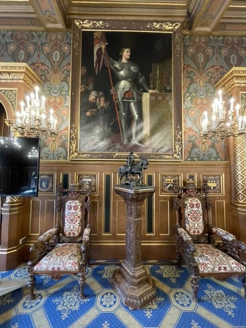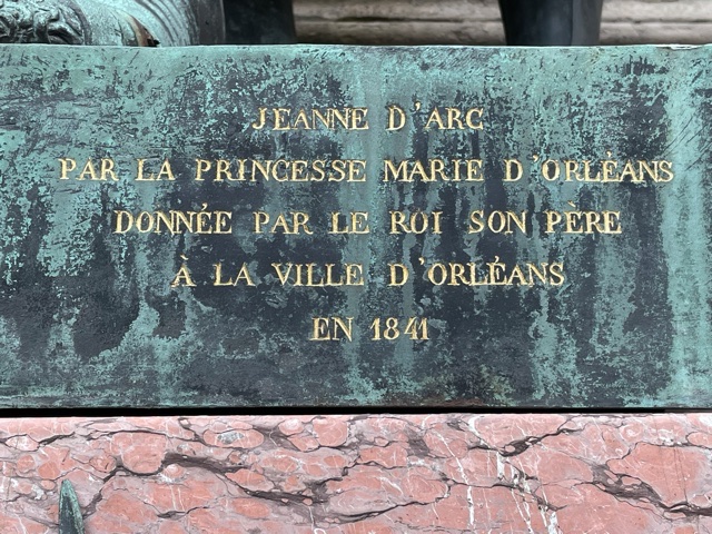 On continue à côté de l’église à l’Hôtel Groslot, l’ancienne mairie. On y trouve une autre statue de Jeanne d’Arc, fait par la princesse Marie d’Orléans, la fille du Roi Louis-Philippe, une sculptrice talentueuse. Faut-il vraiment que je vous dise qui l’a abîmée par des balles en 1944 ? L’hôtel a un joli petit jardin où on peut encore se marier (l’actuelle mairie est juste en face), et à l’intérieur, on y trouve de jolies décorations façon « gothique troubadour » (encore, selon notre livre).