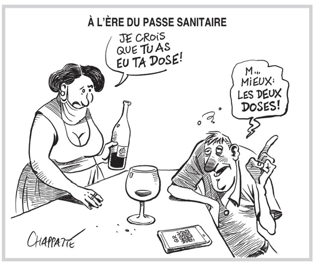 Cette semaine, Le Canard Enchaîné est un peu obsédé avec le pass sanitaire. Parmi mes amis, je dirais que la moitié soutient le pass, et le reste est contre. En Californie, c’est à votre honneur — beaucoup d’entreprises veulent que vous soyez vaccinés pour entrer, mais personne ne vous demande votre carte de vaccination. En tout cas, si on ne sort jamais, on n’a jamais besoin d’un pass !