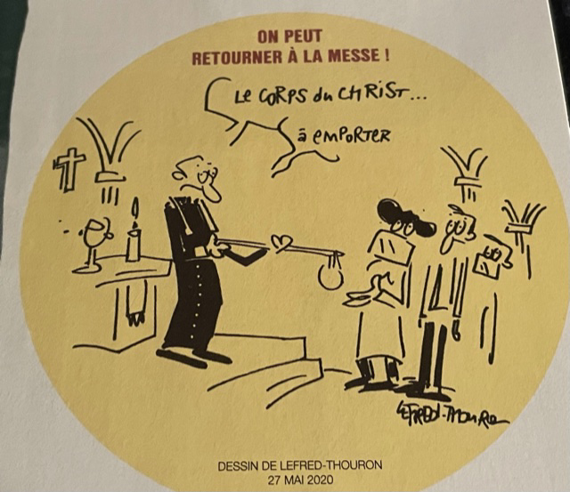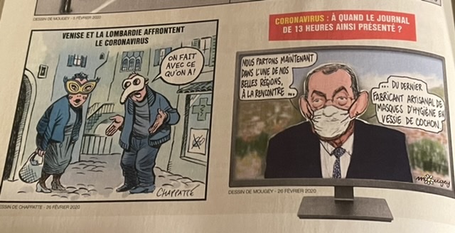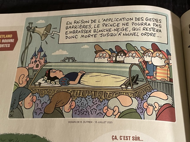 J’évite de parler de la politique ici, mais je ne vais pas le nier — il y a un sujet qui domine les nouvelles cette semaine, dont dans Le Canard Enchaîné. Franchement, j’apprécie qu’ils aient la même attitude envers nous qu’en 2020. Je vais donc mettre leur plus critique dessin en premier.