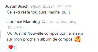 Pour être clair, Laurence parle aussi l’anglais. Je voulais aussi faire partie de conversations comme celle-ci (pendant le concert) :