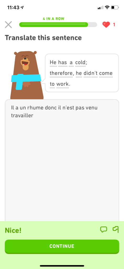 En fait, je sais que j’ai raté deux jours pendant tout ce temps. On peut gagner quelque chose dans Duolingo appelé « streak saver » ( sauveur de séquence ) pour ne pas perdre ses records. J’ai laissé les confins de Duolingo il y a longtemps, mais je reste reconnaissant. Quelques souvenirs de voyage :