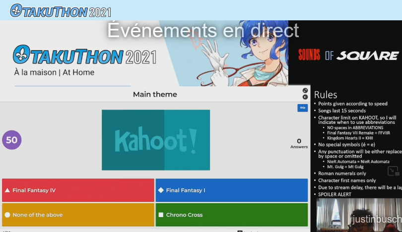 Chaque année, il y a un congrès pour les fans de la culture japonaise à Montréal, appelé Otakuthon. Pendant ces dernières deux années, tout se passe en ligne à cause de Covid. Je ne connaissais pas Otakuthon jusqu’au moment où j’ai découvert Laurence Manning. Elle y joue un concert chaque année, et c’est mon rêve d’y assister dans la vraie vie. Ce week-end est le deuxième Otakuthon « à la maison ».