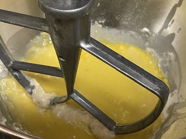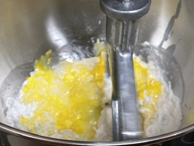 - Quand la pâte est homogène, ajoutez le second oeuf, mélangez et arrêtez le robot. Versez le beurre, attendez qu’il passe sous la pâte.