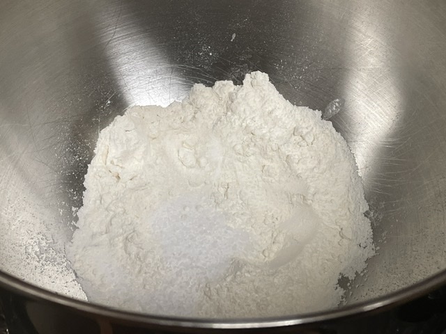 - Mettez dans la cuve d’un robot la farine, le sel et le sucre.