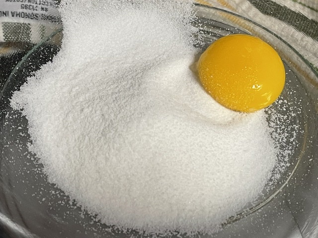 - Fouettez le sucre et le jaune d’oeuf.