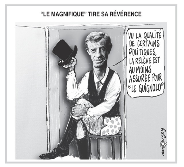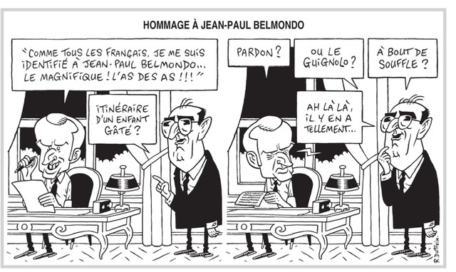 J’imagine qu’il y avait beaucoup de changements à la dernière minute chez Le Canard Enchaîné cette semaine. La mort d’une icône nationale comme Jean-Paul Belmondo demande plus que un dessin, plus qu’un gros titre. Mais il y avait plutôt moins de choses sur le triste événement que je ne l’aurais attendu. Ce n’est pas à dire qu’ils ont échoué.