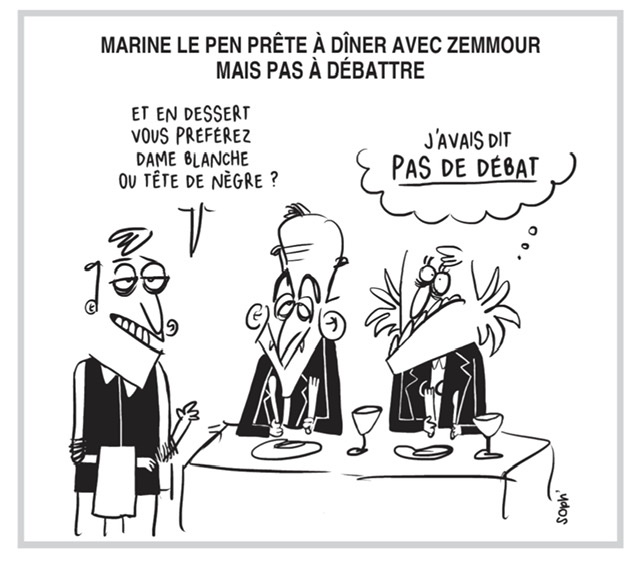J’ai entendu parler de M. Zemmour pendant que j’étais à Paris, mais je ne le connais vraiment pas. Vu avec qui il dîne, et les noms des desserts, le point est bien évident. J’ai lu que l’on n’appelle plus ce dessert « tête de nègre » — c’est plutôt tête au chocolat. Dois-je vous dire qu’aucun journal aux États-Unis n’aurait publié ce nom-là en anglais ? Petit renseignement — en anglais, on appelle la dame blanche « sundae, » un mot très proche à notre mot pour dimanche (Sunday), mais personne ne sait d’où vient vraiment le nom du dessert.
