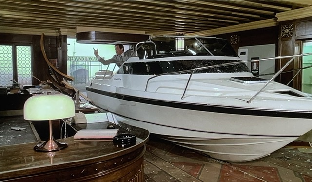 Après cette scène, il monte sur une croisière où il fait plusieurs escrocs en faisant semblant d’être un maharadjah. Le premier ne marche pas, et la deuxième fois, il s’avère que son victime fait aussi un escroc ! Le moment le plus drôle du film — Belmondo utilise du parfum Chanel No. 5 comme sels !