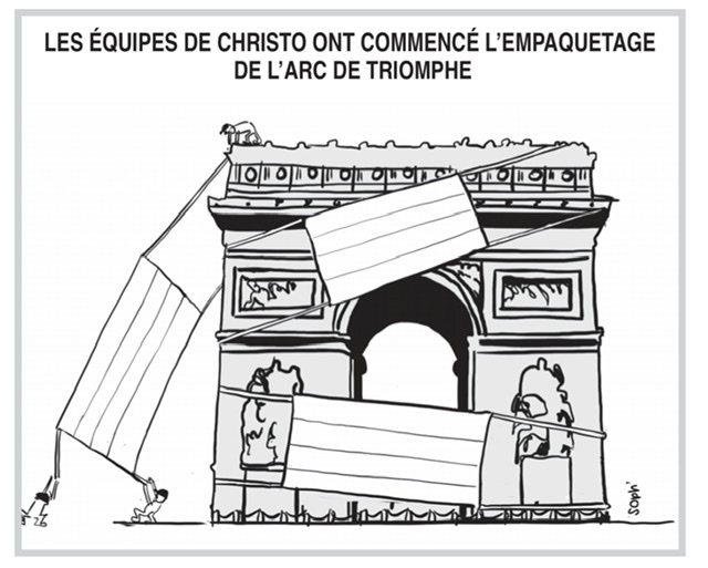 Je n’étais jamais grand fan du « artiste » Christo avant de ses aventures avec l’Arc de Triomphe. Franchement, son projet m’a mis en colère parce que je n’ai pas pu voir l’extérieur de l’Arc. Et vous avez payé 14 millions d’euros pour le droit de le regarder pendant un mois ! J’étais donc heureux de trouver des dessins à propos du sujet dans le dernier Canard :