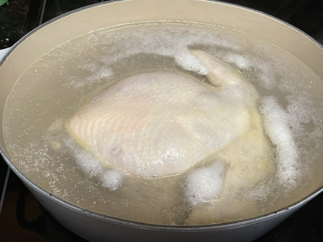 - Déposer la poule dans un grand faitout, la couvrir d’eau froide. Porter à ébullition et retirer les premières écumes.