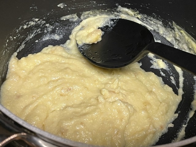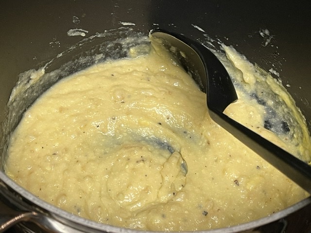 - Hors du feu, verser ce mélange dans la sauce chaude, fouetter énergiquement. Ne pas reporter à ébullition. Vérifier l’assaisonnement. — J’ai trouvé que j’ai eu besoin de plus de bouillon pour faire une sauce liquide — pendant cette étape, j’ai ajouté 50 cl de plus de bouillon, deux fois, alors 150 cl total.