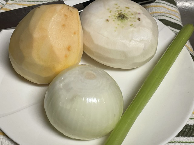 - Une fois le bouillon de poule bien clair, plonger les carottes, les navets, le rutabaga, le céleri, l’oignon piqué de clous de girofle et le bouquet garni.