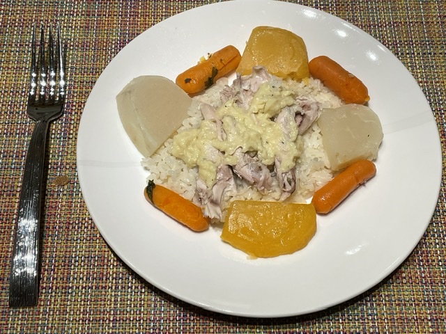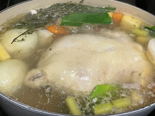 Ce soir, j’ai fait mon dîner façon Eure-et-Loir, la poule au pot. Mon dessert prend quelques jours pour préparer, alors veuillez patienter. Sachez que c’est un plat lié avec le roi Henri IV, alors quand vous mangez celui-ci, vous mangez comme un royal ! (En fait, c’était son rêve pour les laboureurs, pas lui-même.)