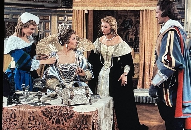 Pendant ce temps-là, la reine voit son amant, le duc de Buckingham (premiere erreur : les relations à distance) Elle lui donne des ferrets (un mot anglais qui veut dire furets ; j’ai eu des problèmes de rire pendant la reste du film) en preuve de son amour interdit.