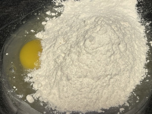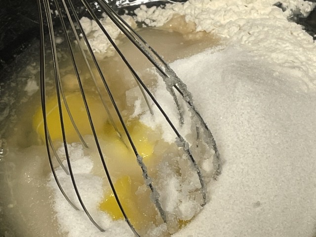 1. Dans un saladier, mettre les œufs, le sel, la farine, le sucre, et le rhum. Battre tout avec un batteur plongeant ou batteur à œufs.