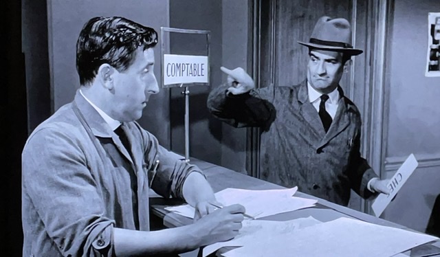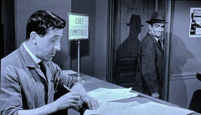 On retourne dans l’usine et on rencontre de Funès pour la première fois. Il est responsable de l’usine, et il y a un moment vraiment drôle avec Jean Lefebvre comme comptable. Il fait une erreur de calcul, et il est rétrogradé. Regarde le panneau :