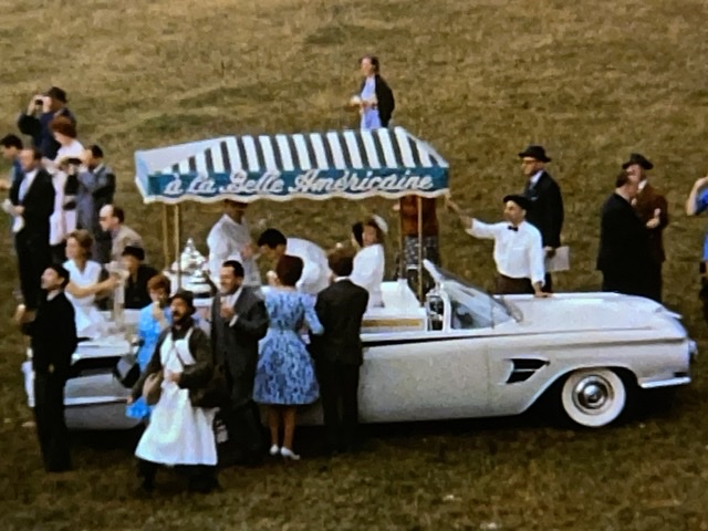 Il achète une voiture américaine, selon Wikipédia, un Oldsmobile modifié pour le film. (Ma famille avaient plusieurs Oldsmobiles, mais la marque est disparue.)