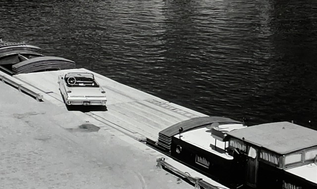 Dans la rue, la voiture commence à rouler parce qu’il n’a pas mis le frein à main, et la voiture roule jusqu’à une péniche :