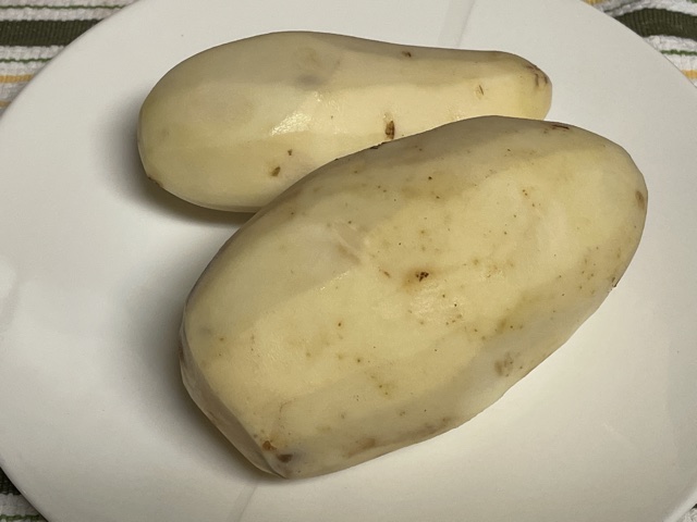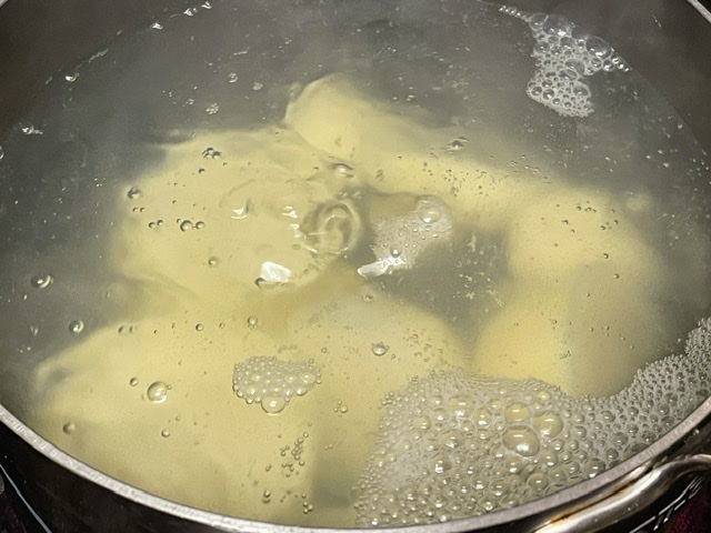 - Épluchez et faites bouillir vos pommes de terre. — Les miennes étaient grosses, alors je les ai coupées en gros dès.