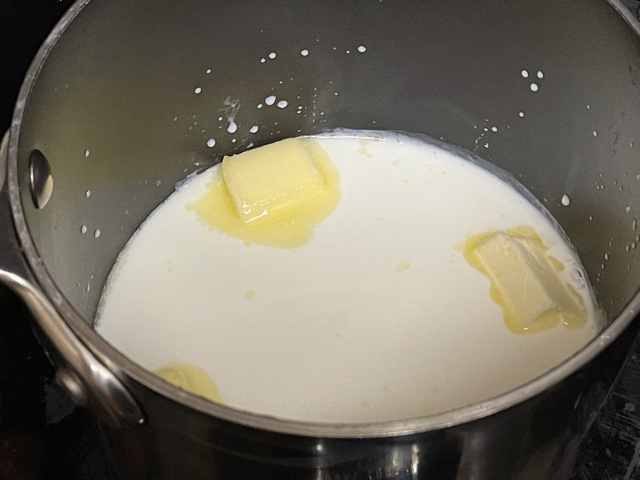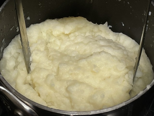 - Mixez votre purée au moulin à légumes ou à l’écrase purée avec le beurre et le lait chaud. Assaisonnez de sel, poivre et muscade si vous le souhaitez. — Ma casserole n’était pas trop grande, alors je les ai mises en plusieurs fois. Le beurre était celui de Charentes-Poitou.