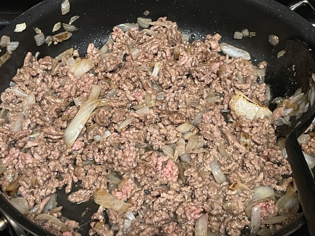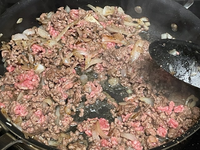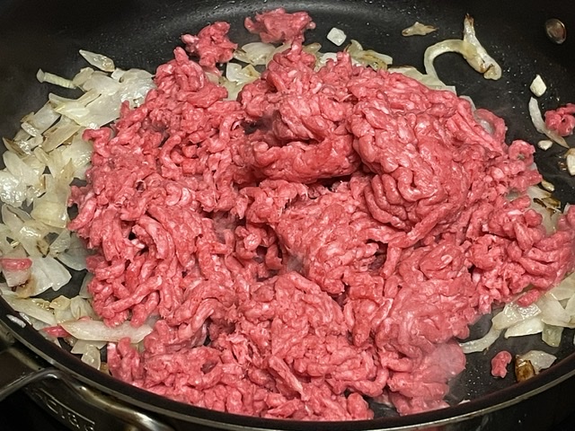- Lorsqu’ils sont sont décolorés, ajoutez votre viande hachée et faites cuire quelques minutes. Salez et poivrez.